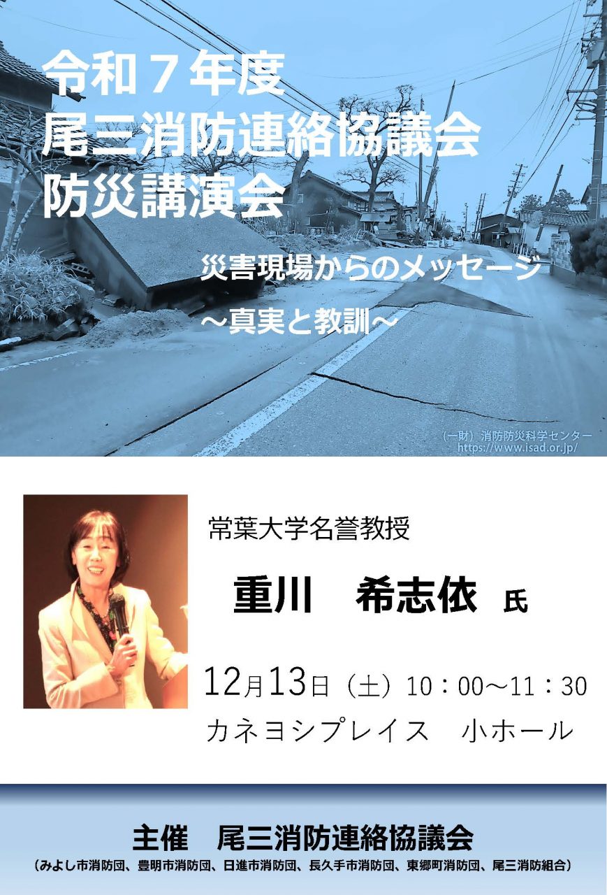 地震はいつ起こるかわかりません。自分、家族、地域を守るために、日頃から地震に対する備えをしておくことが重要です。講師の重川氏は内閣府中央防災会議委員、総務省消防庁消防審議会委員を歴任され、災害に強いまちづくり、人づくりのための教育プログラム等の研究や災害弱者が安心して暮らせる地域づくりのための活動を続けておられます。皆さまも講演会にお越しいただき、いつやって来るか分からない地震に備えるため、ともに学びましょう。