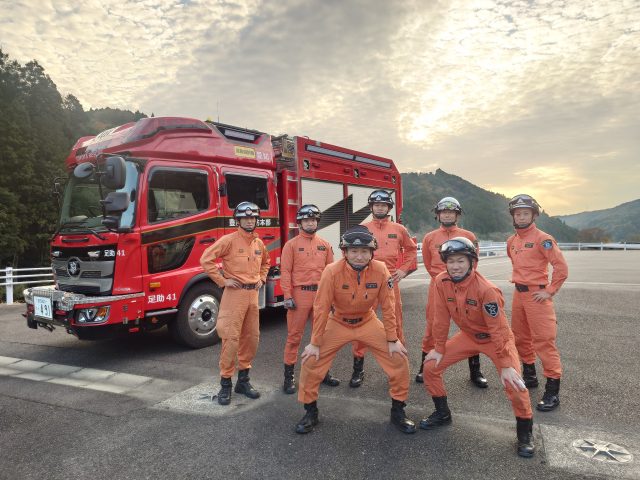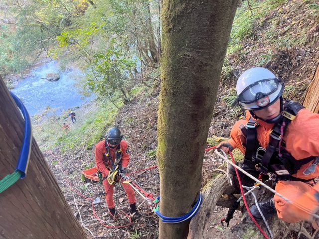 豊田市消防本部と職員の人事交流を行い、救助訓練や救助業務について意見交換を実施しました。実際の山を使用した救助訓練では、低所にいる要救助者を山の上まで搬送し、川にロープを張り、対岸まで救出しました。訓練後は、意見交換を実施することで、お互いの消防本部の技術及び知識を共有し、消防力の強化に繋がる充実した訓練となりました。