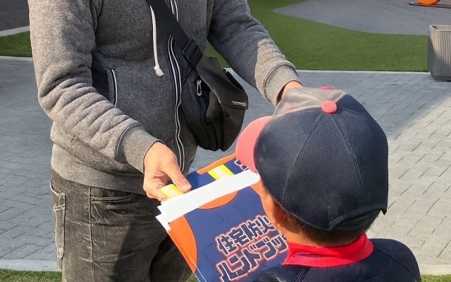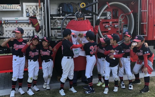 広報会場では日進市内に拠点を置く少年野球チームの皆さんと突如出現した「消火器マン」が協力して、住宅防火ハンドブック等の配布を通じ、住民の皆さんが自ら行える防火対策を広報しました。