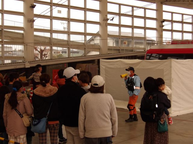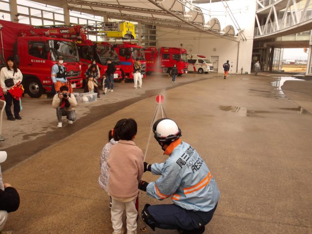 来庁者を対象に訓練見学会及び災害対応ミニ講座を開催しました。交通事故により自動車の下敷きになってしまった要救助者を救助するという想定の訓練を間近で見学していただきました。ミニ講座では、煙体験ハウスを用いて煙の特性や怖さを学び、火災時における避難方法を体験していただきました。また、水消火器を使った防災訓練も行っていただき、消火器の基本的な使い方に加え、初期消火の重要性についても学んでいただきました。